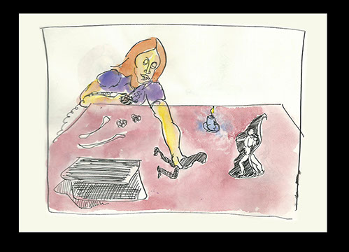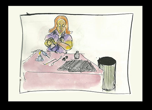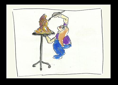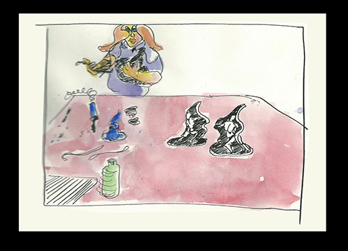 The first step is to create the sculpture in a wax format using microcrystalline wax. I tool it with dental tools and heat them with a candle or an alcohol lamp. For the heavier changes I use a soldering iron.