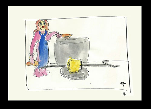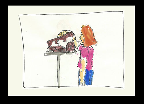 Pouring the investment (mold material) is a careful process so that you don't allow the heavy liquid to disengage the gating from the sculpture. You need to fill the basket to the top making sure that the material surrounds the wax equally at all sides.