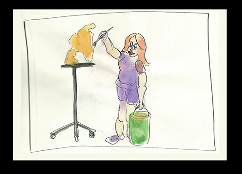 After the "gating" (wax rods) have been melted onto the sculpture, then I apply a layer of face coat (plaster mixed with sand ) to the entire surface. This secures the detail prior to adding the balance of the mold material that houses the wax.